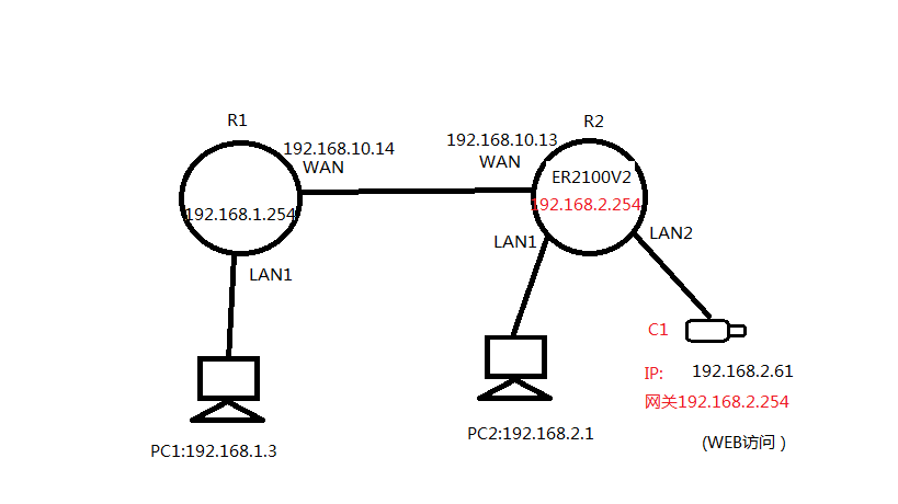 PC2能够远程桌面连接到PC1,能远程管理R1,能通过浏览器访问C1。 问题: PC1无法通过浏览器访问C1,通过跟踪路由tracert只能跟踪到R2 WAN口,请问这是为什么?是ER2100v2设置问题吗?