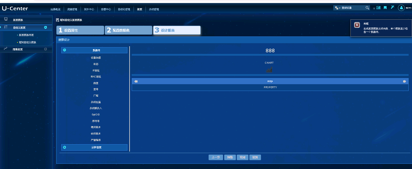 自定义报表模板这里怎么设置,点完成会出现这个提示。但是里面有操作不了什么