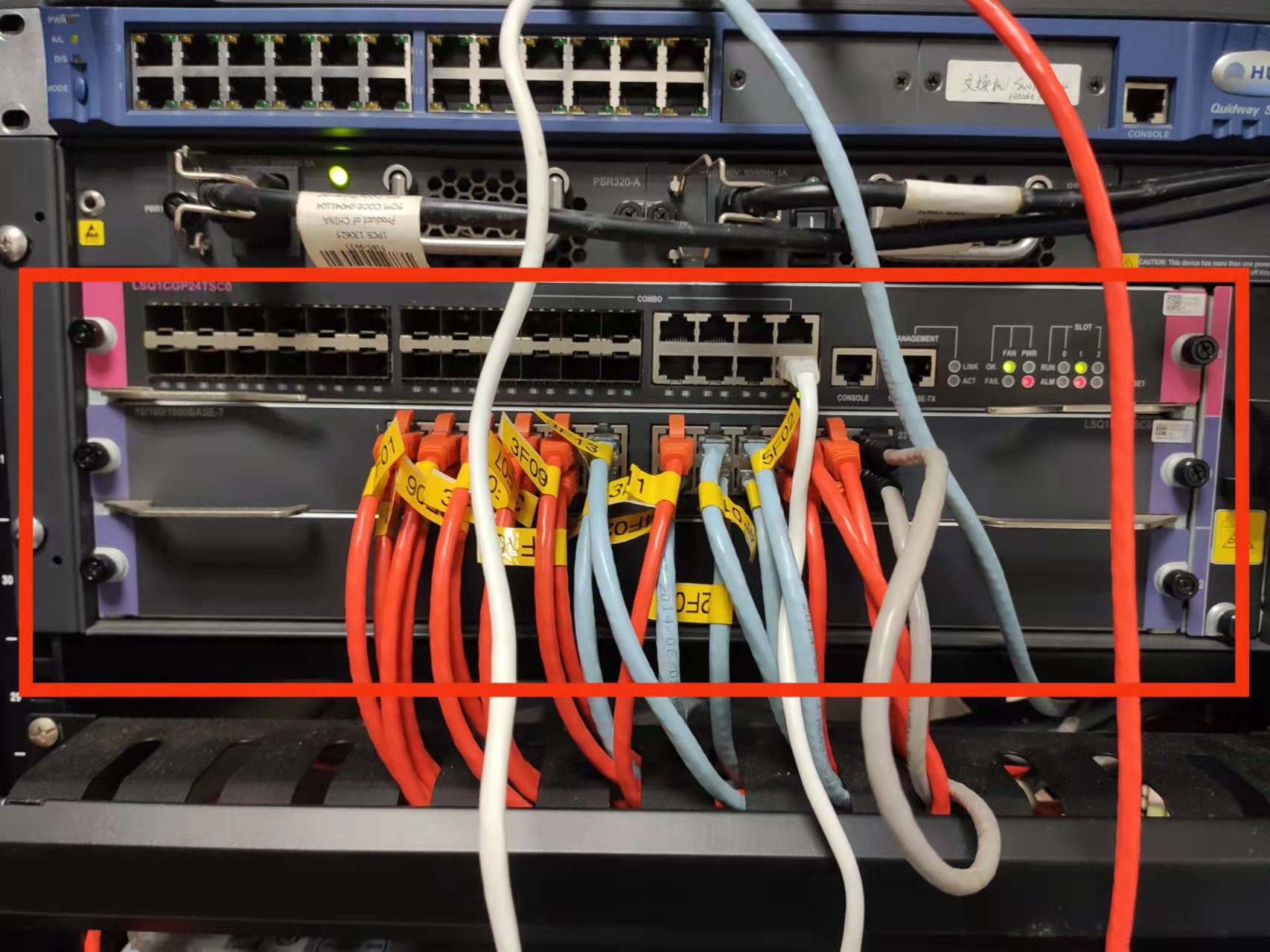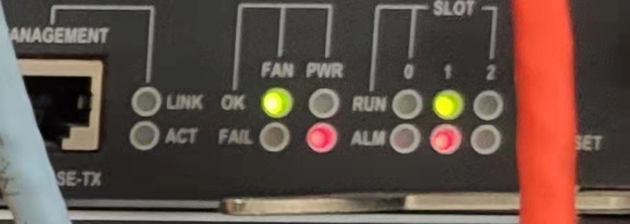 slot 1和电源的红灯亮了,查一下电源输入输出是否正常,再看一下slot1 上端口是否能正常UP