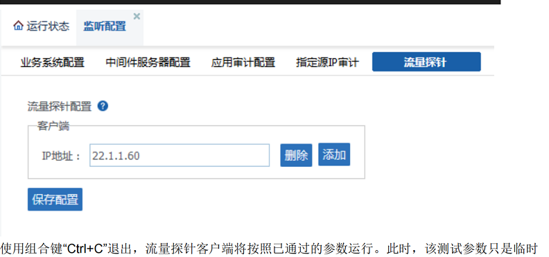图标,弹出探针配置窗口,用户可根据需要对流量探针进行详细配置,如探针名称、探针IP、备注、监听网卡选择、关联业务系统,指定端口/源IP审计配置等,配置完成之后,点击<确定>按钮,系统提示修改探针配置成功,该流量探针移入已注册探针列表,并开始转发流量。