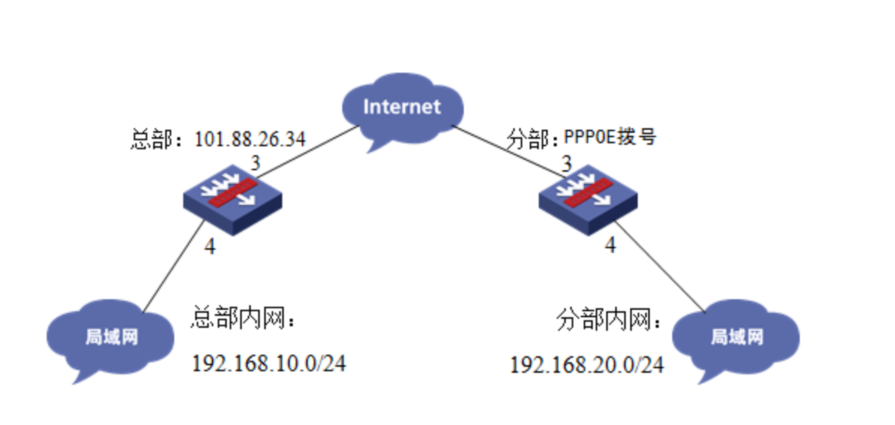 总部和分部各有一台防火墙部署在互联网出口,因业务需要两端内网需要通过VPN相互访问。IP地址及接口规划如下表所示: