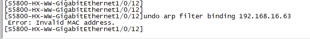 直接报错啊[S5800-HX-WW-GigabitEthernet1/0/12]undo arp filter binding 192.168.16.62 000c-29ff-e130 ^ % Wrong parameter found at '^' position.
