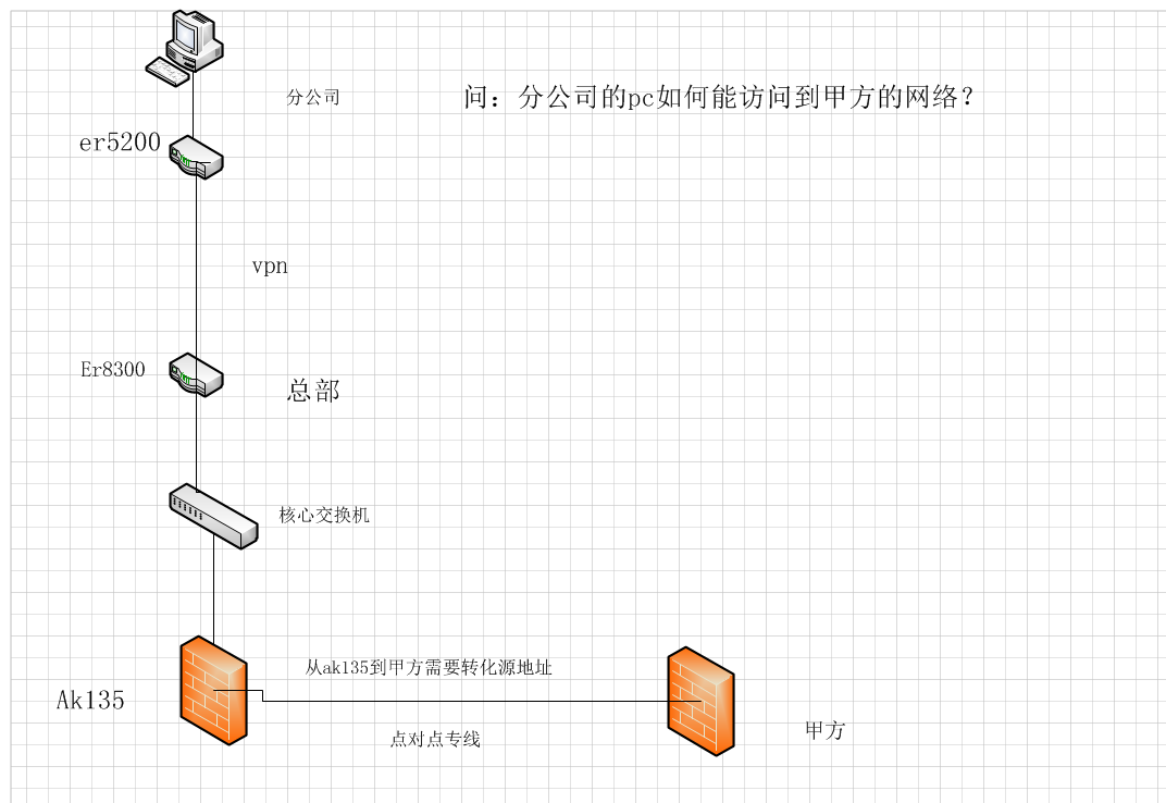 分公司用er5200和总部的er8300做vpn链接,总部的ak135防火墙要做nat源地址出去甲方,总部现在配置是可以到甲方的网络的,问分公司的电脑如何才能访问甲方网络? 谢谢了