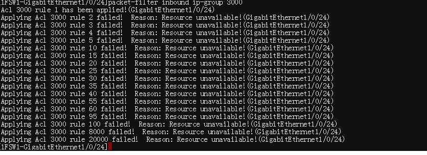 acl在接口应用,一些接口报错,例如24口,其中除了rule 1生效,其它报错