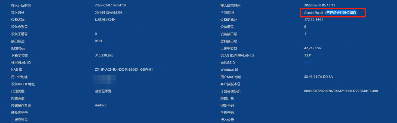 用户到时间自动下线,日志提示管理员进行复位操作