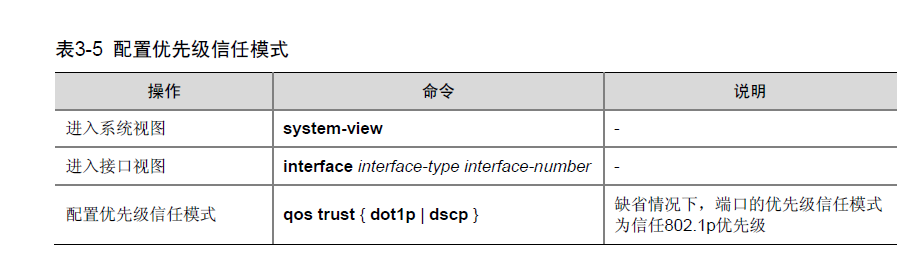 这个意思如果不配置qos trust,那么都不信任,如果只配置qos trust,那么默认信任dot1p,如果想信任dscp,就配置qos trust dscp,优先级就是dscp的前三位,如果想信任优先级,配置dscp就可以