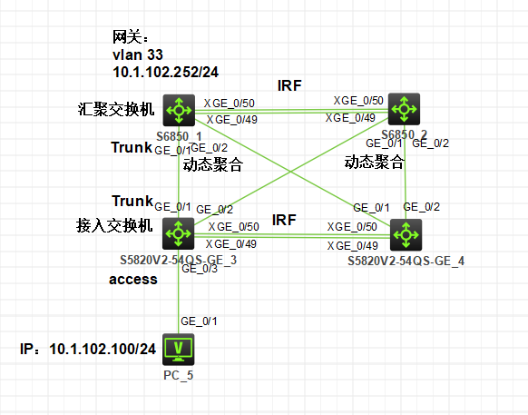 汇聚交换机下行聚合端口为Trunk,汇聚交换机上行据聚合端口为Trunk,下行端口为access,在pc上ping不通汇聚上的网关地址