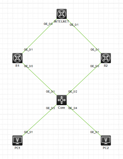 请问下如何实现正常状态下PC1走R1,PC2走R2