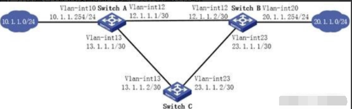 Switch A作为10.1.1.0/24网段内主机的缺省网关,配置20.1.1.0/24网段的静态路由指向Switch B,并配置静态路由使Switch A、Switch B、Switch C所有直连网段能够互通。通过配置策略路由,对于来自10.1.1.0/24网段的ICMP流量,优先通过Switch C进行转发;对于该网段的其他流量,则通过Switch B进行转发。