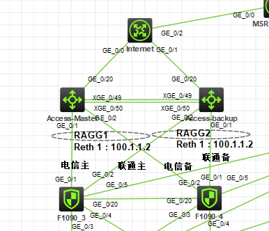 防火墙作为出口部署,2条相同优先级的默认路由负载跑,FW3的1口跟FW4的2口对应的是一个运营商,FW3的2跟FW4的1口对应的是另外一个运营商,前端有2台接入交换机堆叠,防火墙使用冗余口加冗余组进行主备,此时需要配置nqa探测公网IP114来跟冗余组进行联动。