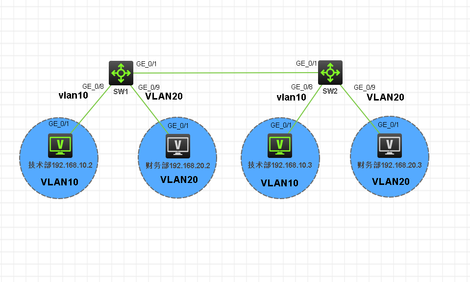 SW2上面的配置和SW1一样,为什么vlan10 和vlan20之间的两台PC无法ping通呢?哪里写错了啊?