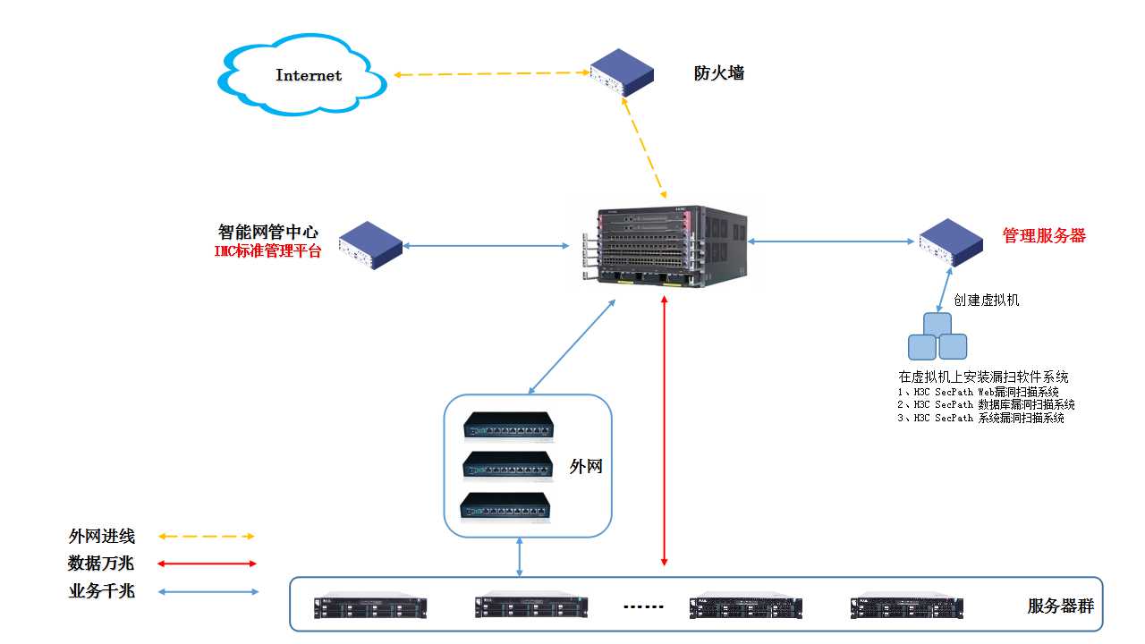 1、下图是组网的大概拓扑图,因管理服务器上不能安装漏扫软件系统,只能安装在管理服务器上的虚拟机里,这组网方式是否可行?