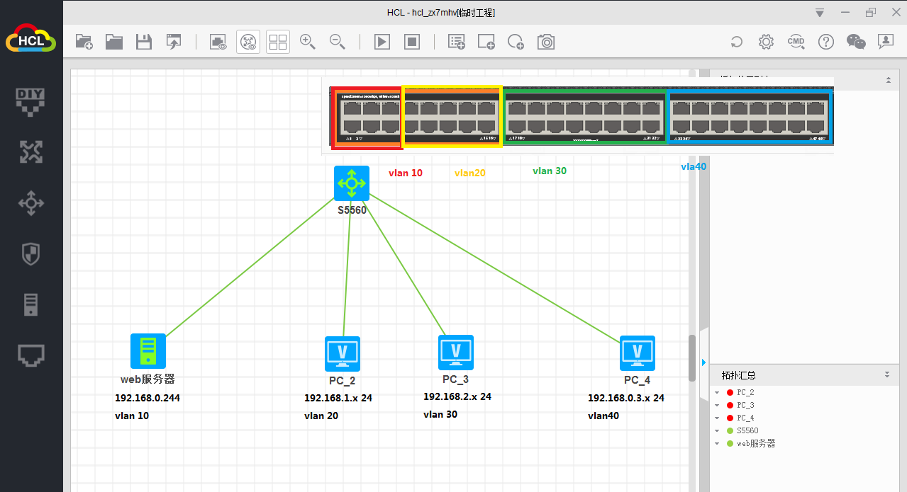 拓扑如下图,192.168.0.244 是服务器 在 VLAN 10 其中交换机的红色口,192.168.1.x 是客户端在VLAN20是交换机的黄色口,192.168.2.x是客户端在VLAN30是交换机的绿色口,192.168.3.x是客户端在VLAN40是交换机的蓝色口。VLAN10 和其他VLAN可以互访,但VLAN20、30、40不能互相访问。要怎么设置?