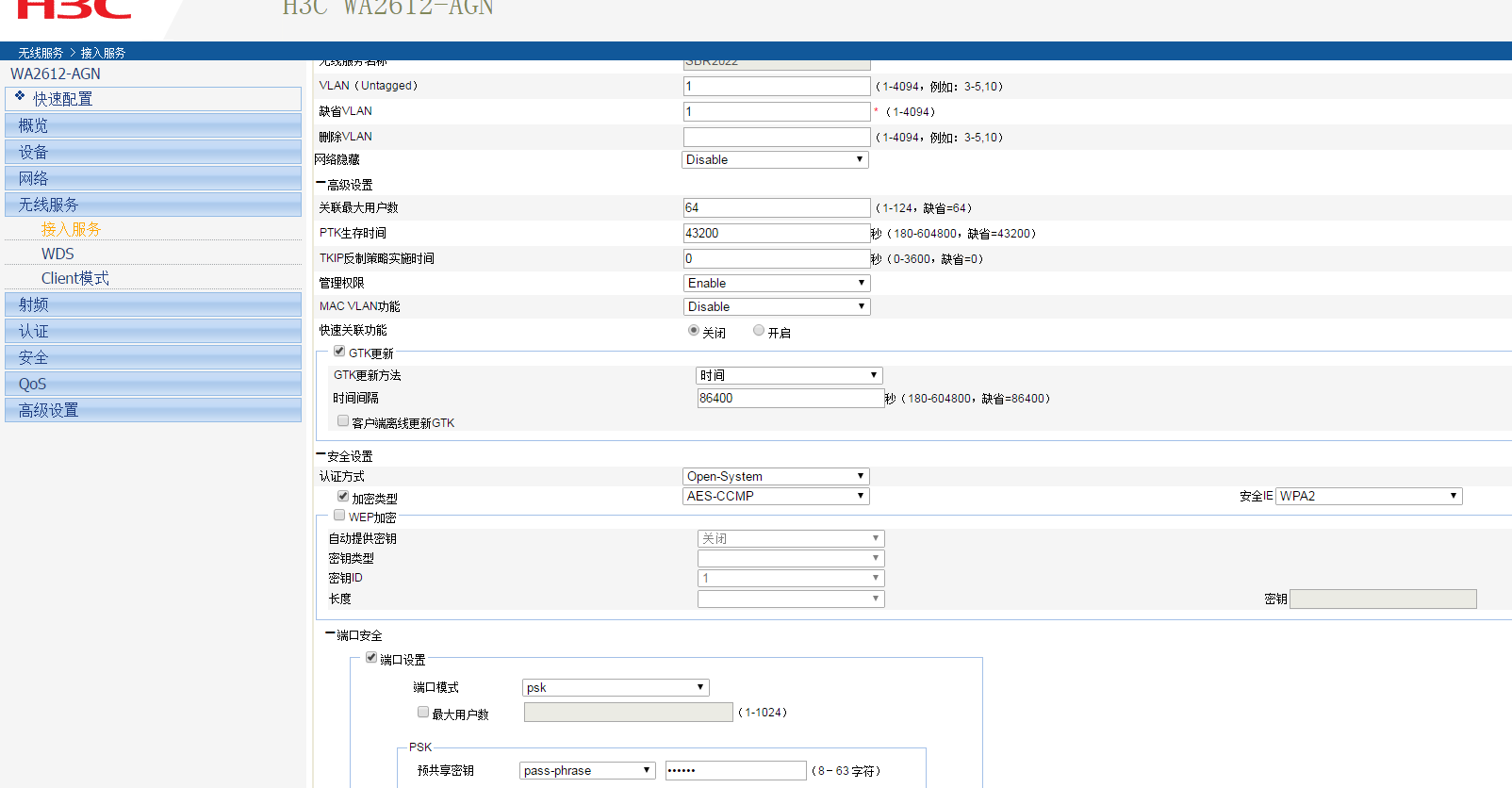 无线服务名称 VLAN(Untagged) (1-4094,例如:3-5,10) 缺省VLAN * (1-4094) 删除VLAN (1-4094,例如:3-5,10) 网络隐藏 Enable Disable +高级设置 -安全设置 认证方式 Open-System 加密类型 AES-CCMP WEP加密自动提供密钥 关闭 密钥类型 密钥ID 长度 密钥 -端口安全 端口设置 端口模式 psk 最大用户数 (1-1024) PSK 预共享密钥 pass-phrase (8个0) 这里好像不能传图片