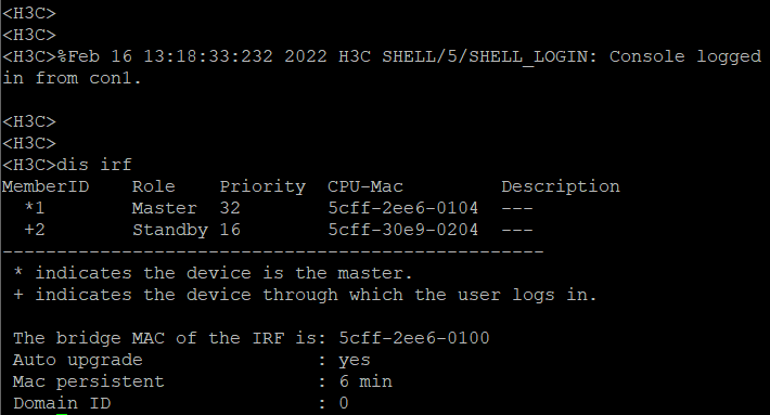 console进去,dis irf。带+的是你登录的设备,带*的是主设备。