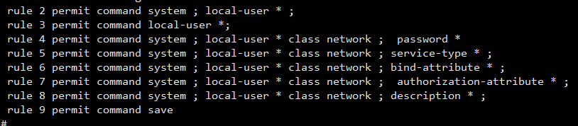 local-user test class manage service-type ssh authorization-attribute user-role role1 # role1角色的内容就是第一张图