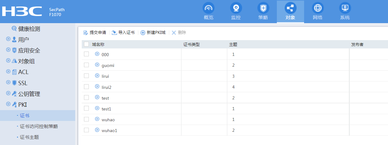 或者打开web界面,在web操作,打开对象——pki——证书,新建一个pki域,然后导入证书。