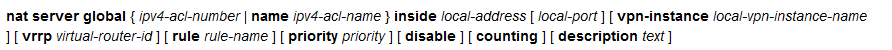nat server global { ipv4-acl-number | name ipv4-acl-name } inside local-address [ local-port ] [ vpn-instance local-vpn-instance-name ] [ vrrp virtual-router-id ] [ rule rule-name ] [ priority priority ] [ disable ] [ counting ] [ description text ]