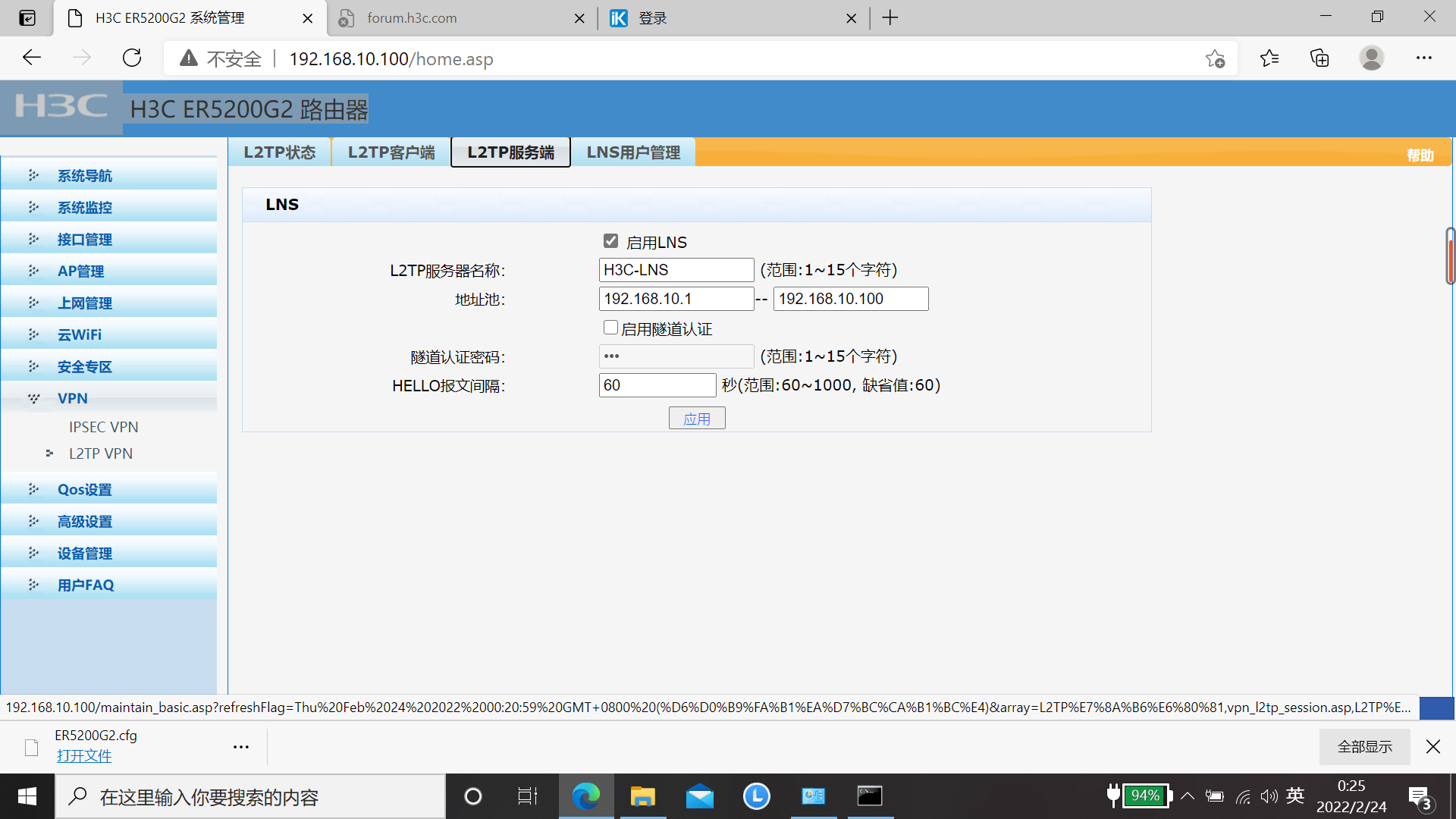设置好L2TP服务端,LNS用户,客户端电脑上的VPN也设置完成。
