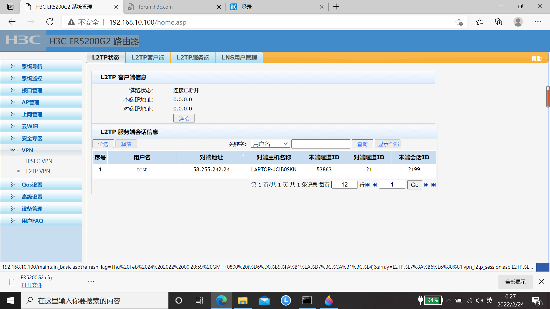 联接成功,在L2TP状态下,L2TP服务端会话信息中,出现联接成功的信息。