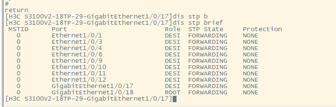 如图,交换机下接的一台电脑,网络时好时坏,交换机是s3100v2,从华三交换机上的ge17接到电脑上,中间经过两台傻瓜交换机,测试了那两台傻瓜交换机没有问题,华三配置的rstp 这是stp接口截图