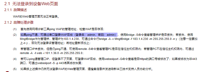 如果ping不通,可通过串口登录WAF后台(登录名:admin,密码:admin)