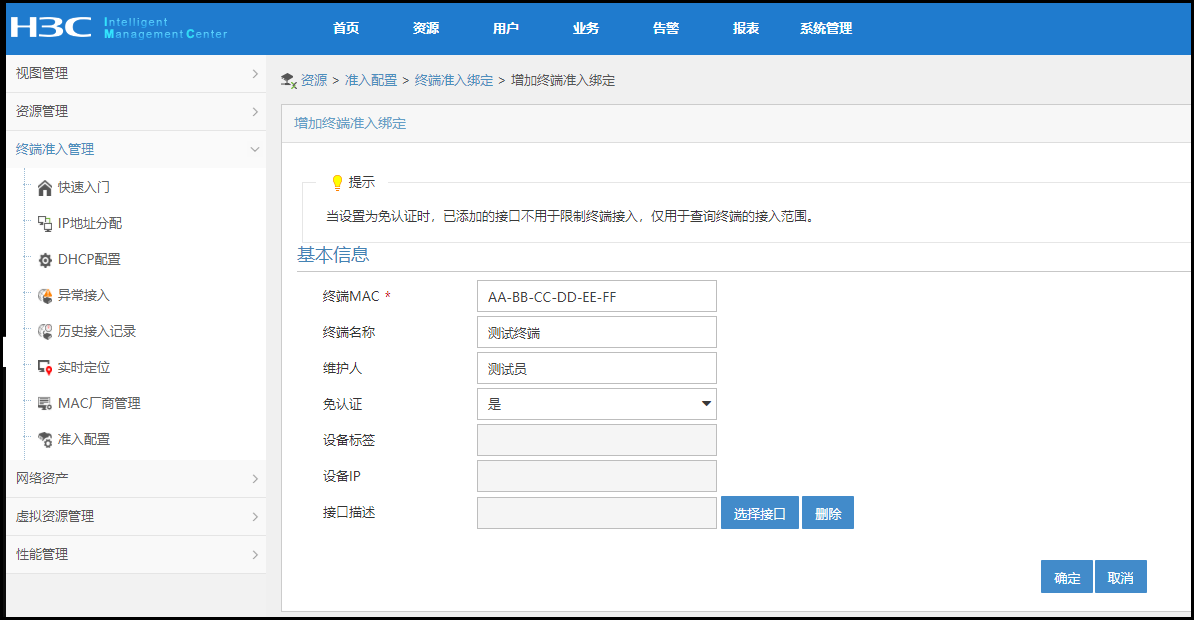imc智能管理中心后台 -> 资源 -> 终端准入管理 -> 准入配置 -> 终端准入绑定 -> 增加绑定 -> 填写物联网设备mac地址,免认证选项设置为“是”,点击确定按钮后,该物联网设备未能连接外网。