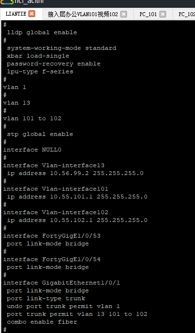 汇聚--接入交换机,网关在汇聚!VLAN13是接口地址(这些需要配置?),vlan 101 和VLAN102是业务地址,现在PC之间PING不通