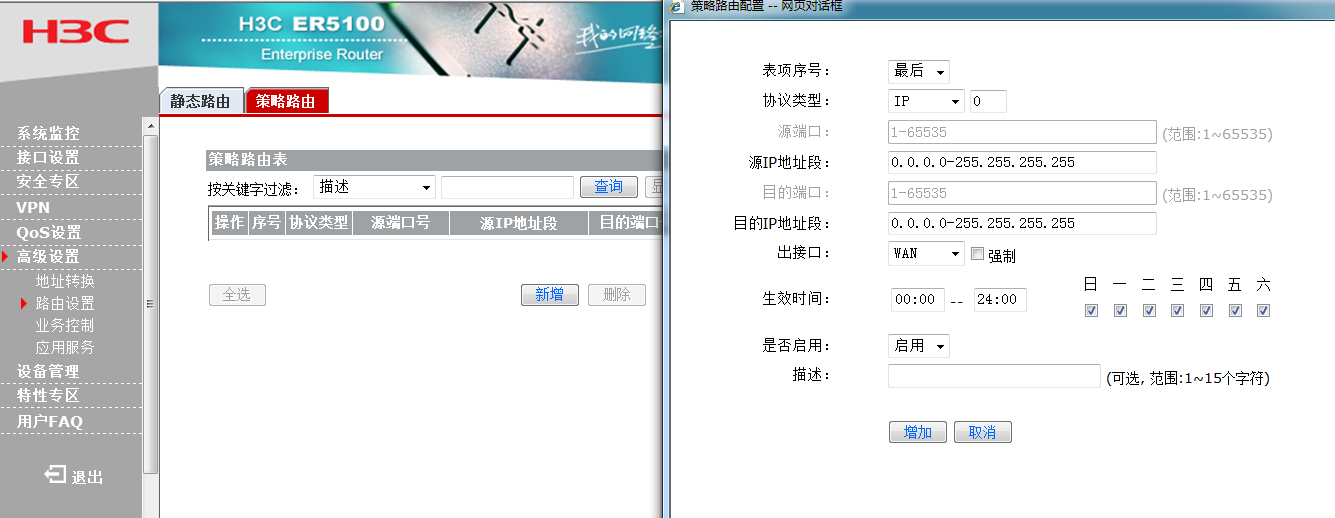 表象顺序,有最前选择最前,源地址段写你需要重定向的地址段,目的地址段不用改,出接口选择正确的wan口出去,其他的都用默认的