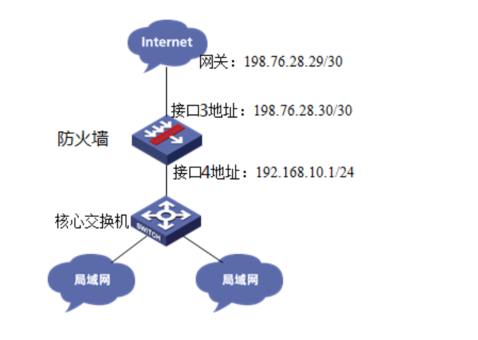 将防火墙部署在互联网出口,使用固定IP地址线路接入互联网。运营商提供的IP地址为198.76.28.30/30,网关为198.76.28.29,DNS地址为114.114.114.114。初步规划防火墙使用3接口接入运营商,使用4接口连接内部网络,内部网络使用192.168.10.0网段,要求内网终端可以自动获取到地址并可以访问互联网。