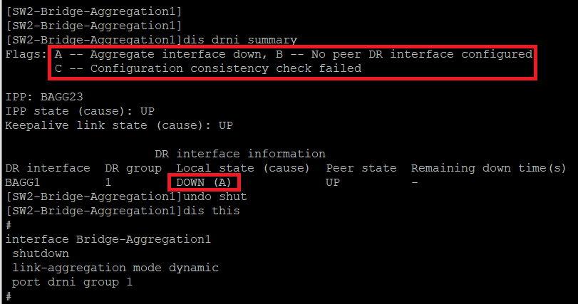 down后面应该有个字母吧,根据提示排查。A说明接口down了;B说明DR邻居建立有问题;C是配置一致性检测失败,说明两台设备的某些drni配置不一样。