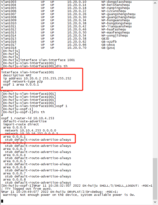 (4) 使用display current-configuration configuration ospf命令查看区域是否配置正确。若配置了两个以上的区域,则至少有一个区域与骨干区域相连。