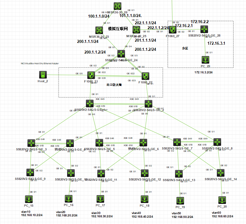 本端:防火墙堆叠做出口,有双出口,做了NAT,配了两个tunnel口,做了GRE+IPsec,下联的核心也做堆叠,网关和dhcp都配置在核心,其他的汇聚和接入交换机只做trunk和access,核心与防火墙之间配置ospf