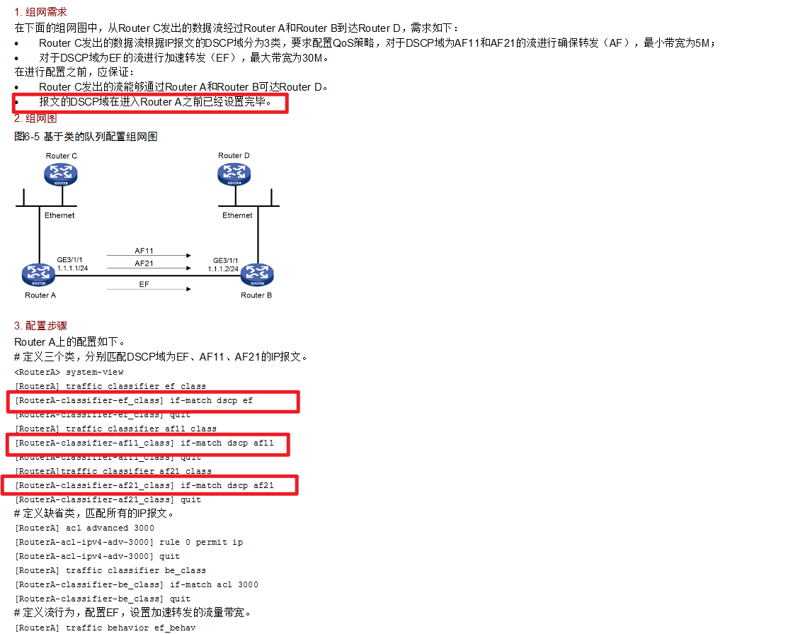 if-match dscp af21这几条匹配类的命令,下边这个案例拿出来直接用了,想知道那部分流量匹配上这些了,是不是系统有一部分匹配省略了,比如把哪些流量标记成ef,把哪些流量标记成af11,这部分配置是省略了吗,还是就是不用配置,系统默认有。我们在真实项目中,需要先把流量标记成ef,af11吗?