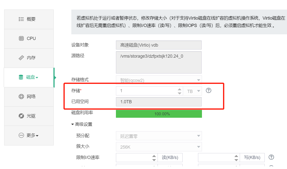 预分配是延迟置零,这个没法在线扩容磁盘