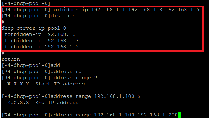 如果不清楚某些命令是针对单个ip还是针对地址范围,可以在输入参数前打个"?"字符获取提示,比如截图address range命令,可以看到"start"和"end",明显是范围。而forbidden-ip的提示明显就是针对单个ip。