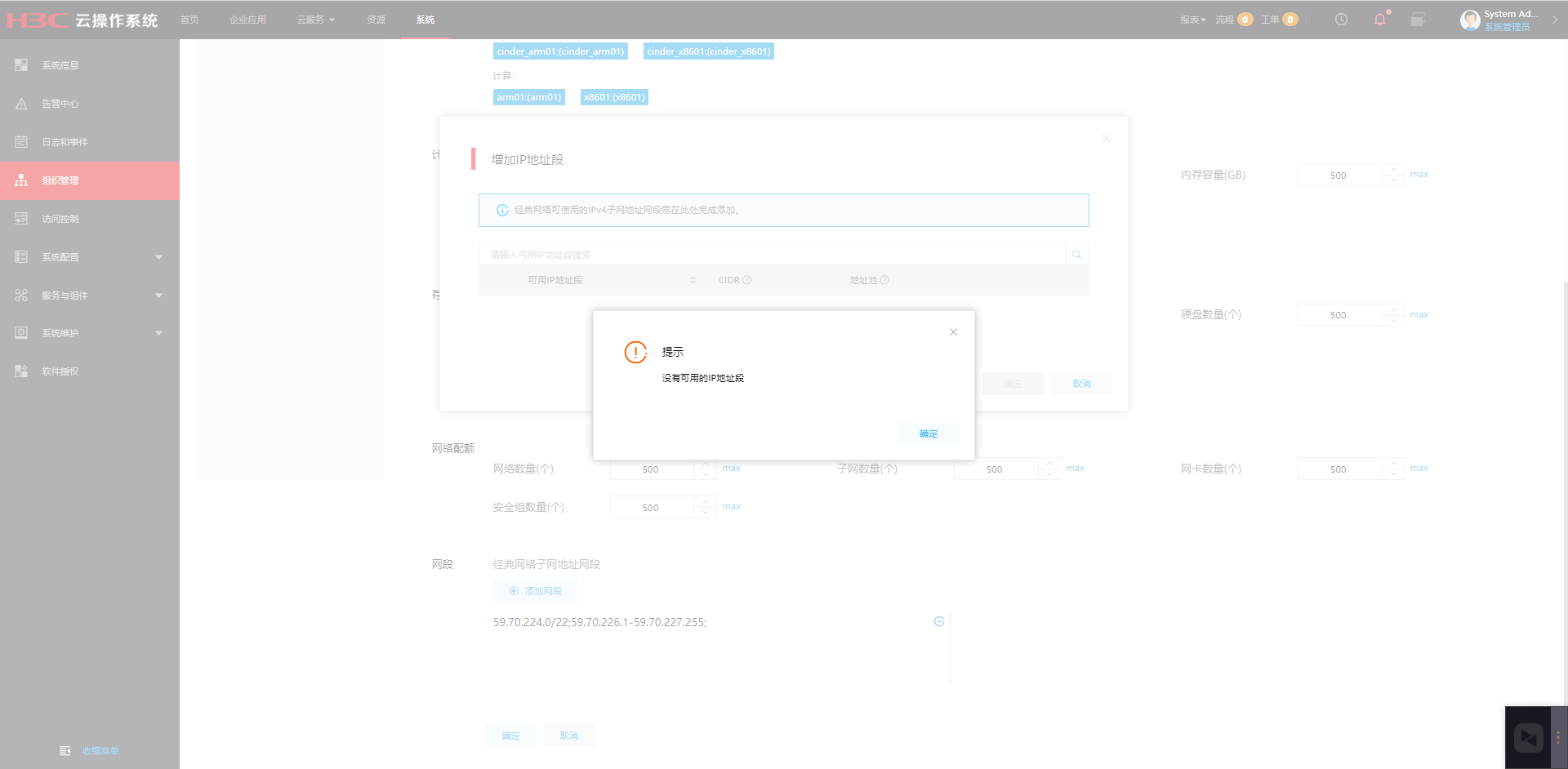 cloudos给子组织分配网段显示无可用地址段