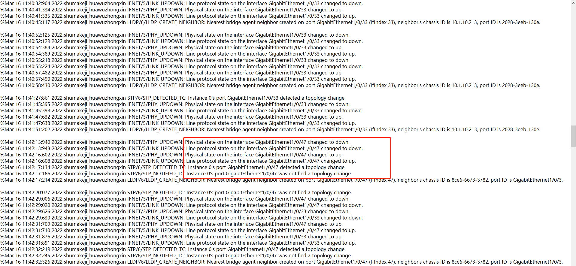 用户接入交换机33口接入的是一台终端设备,频繁出现up/down信息,过了一段时,上联汇聚交换机的47口也出现同样问题,但是通过log看是因为物理链路导致的,单纯从日志上看会和其他原因有关系么,比如环路等