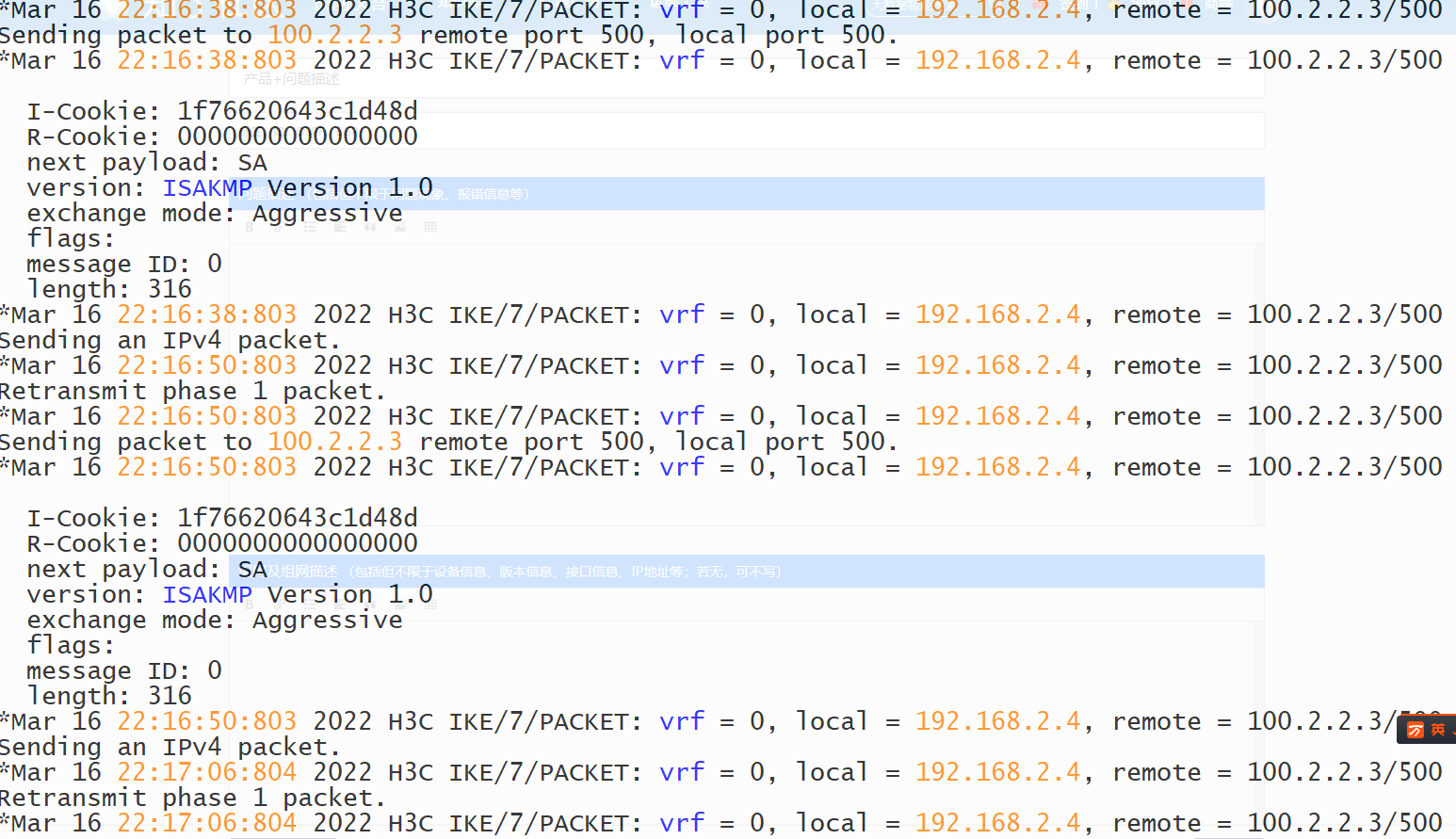 interface GigabitEthernet0/1 port link-mode route combo enable copper ip address 100.1.1.1 255.255.255.0 nat server protocol udp global 100.1.1.1 500 inside 192.168.2.4 500 nat server protocol udp global 100.1.1.1 4500 inside 192.168.2.4 4500 我没有配置NAT