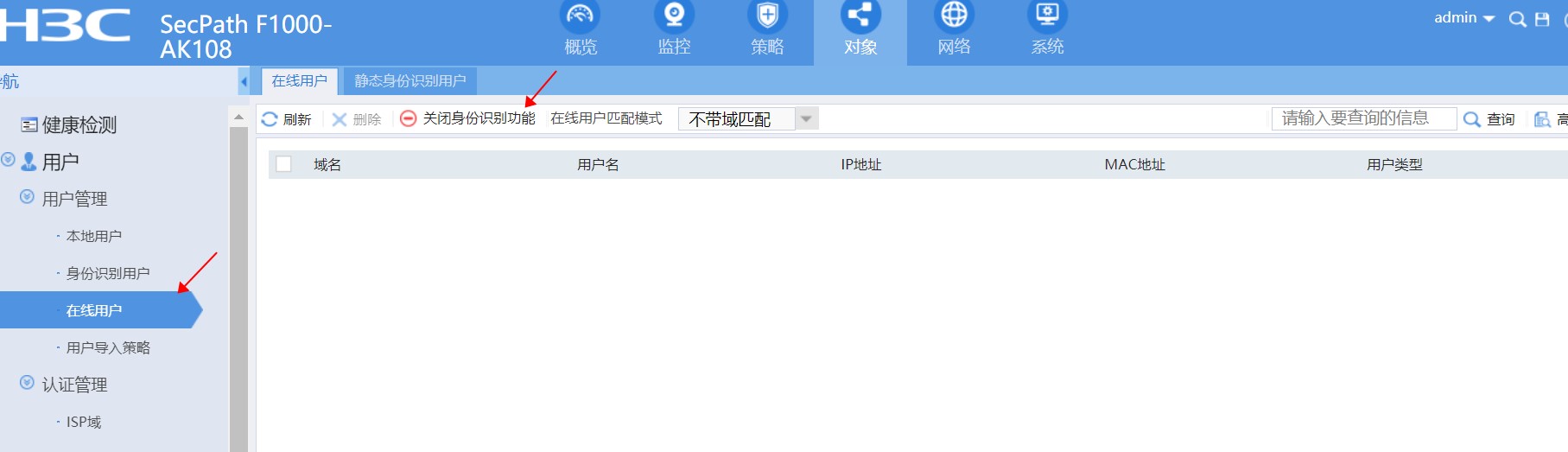· 用户身份识别功能关闭,所有在线用户表项均被删除。