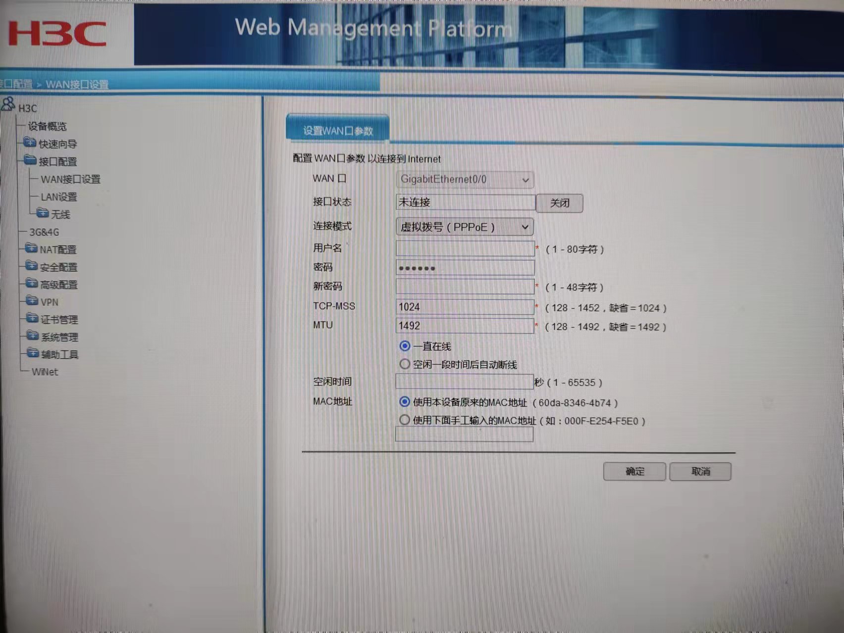 1) #到“设置WAN口参数”页面。WAN口选择实际连接外网的GigabitEthernet接口。连接模式选择“虚拟拨号(PPPoE)”,输入上网账号和新上网口令,TCP-MSS和MTU一般使用缺省值即可。其他参数一般选择默认设置即可。