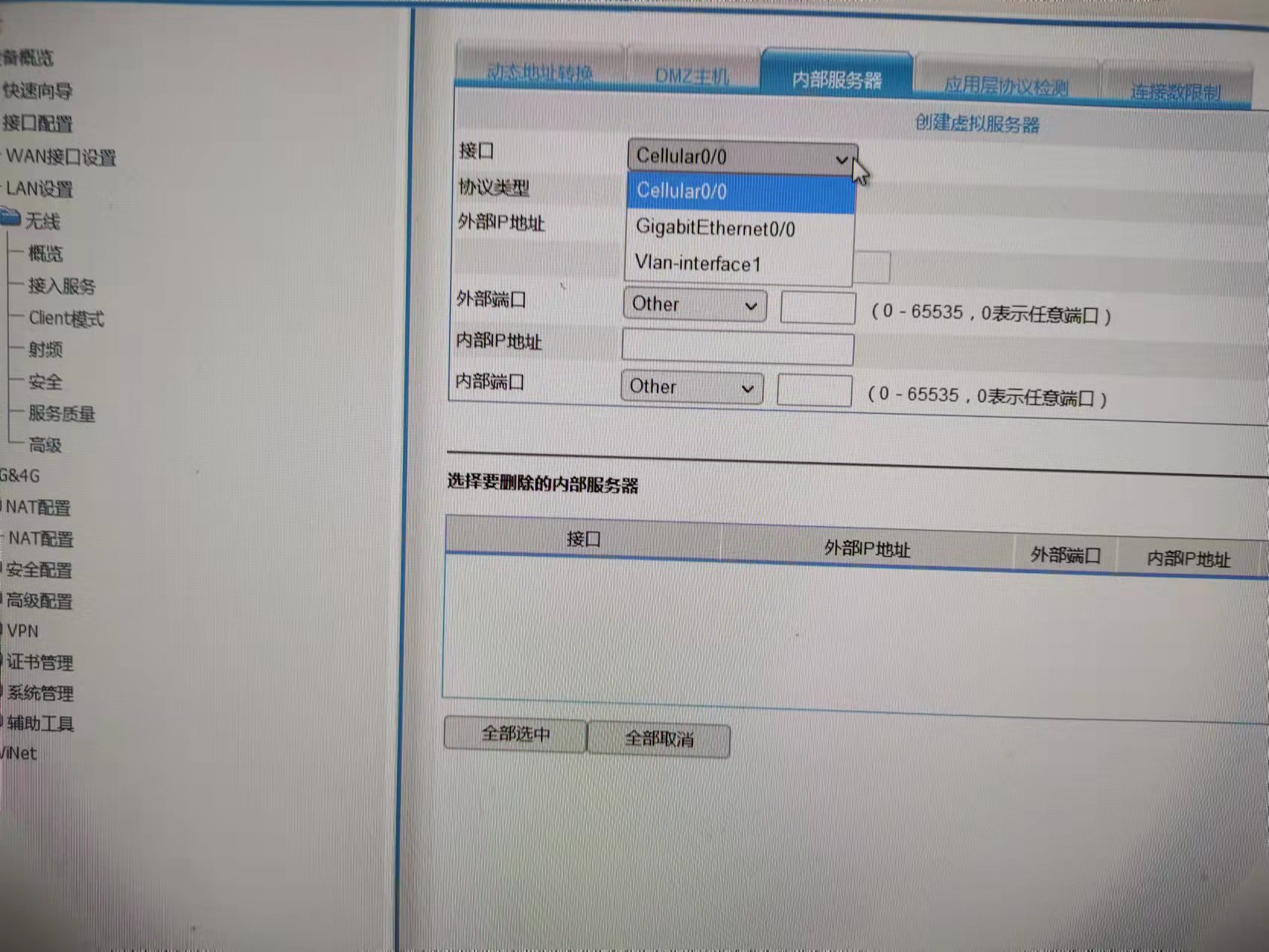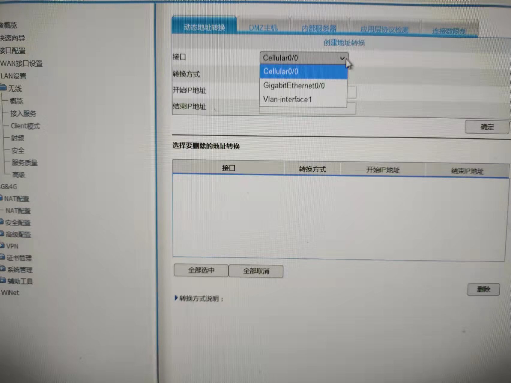 #配置完成之后,如果路由器软件版本是Release 2514P01或者更新的版本(可以在设备概览界面的设备信息模块查看),WAN接口会自动生成NAT配置,全局会自动生成一条默认路由,不需要另行手工配置。如果您的路由器软件版本是Release 2513P59或者更老的版本,那么还需要进行下一步配置。在导航栏中选择“NAT配置 > NAT配置”,默认进入“动态地址转换”页签的页面,接口选择实际连接外网的GigabitEthernet接口,转换方式选择“接口地址”,然后点击“确定”。