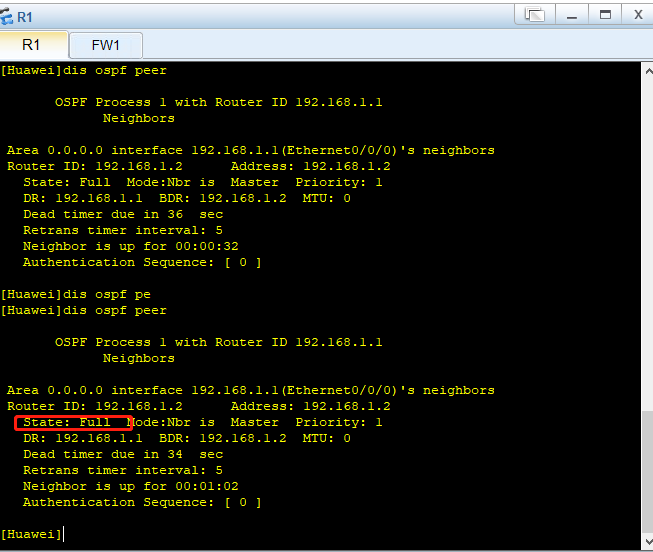 route : interface GigabitEthernet 0/0/0 ip address 192.168.1.1 24 ospf 1 ar 0 network 192.168.1.1 0.0.0.255 FW : interface GigabitEthernet 0/0/0 ip address 192.168.1.2 24 ospf 1 ar 0 network 192.168.1.2 0.0.0.255