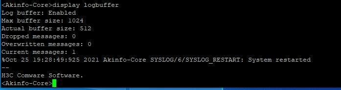 <Akinfo-Core>dis info-center Information Center: Disabled Console: Enabled Monitor: Enabled Log host: Enabled 10.144.111.90, port number: 514, DSCP value:0, host facility: local7 Log buffer: Enabled Max buffer size 1024, current buffer size 512 Current messages 1, dropped messages 0, overwritten messages 0 Log file: Enabled Security log file: Disabled Information timestamp format: Log host: Date Other output destination: Date