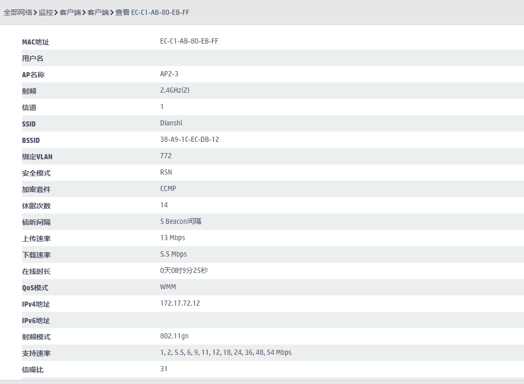 控制器上查看的用户信息如下:电视离ap隔1堵墙,手机连接质量很好,电视连接很卡很卡,能说明是信号差的原因嘛,还是说电视的无线接收能力太差?