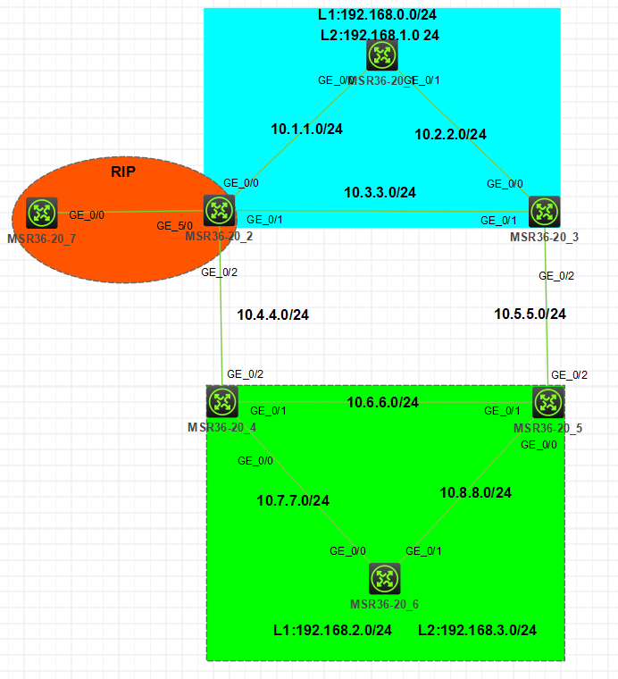 蓝区和绿区两个ospf其实没有必然关系。我猜你的想法肯定是通过BGP传递蓝绿两个区域的路由,那么一般蓝区和绿区的ospf通常都用来学习区域内的loopback,你只要注意,配置ospf时只需要别发布两个区域之间的网段就可以