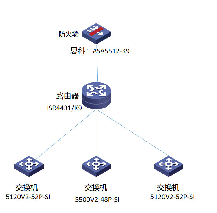 1.防火墙接公网 配置NAT ,与路由器之间配置一个三层互联网段 路由器连接下面的接入交换机 ,路由器配置用户终端的网关地址,交换机配置正常的接入vlan
