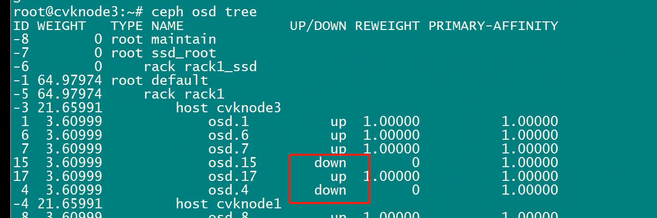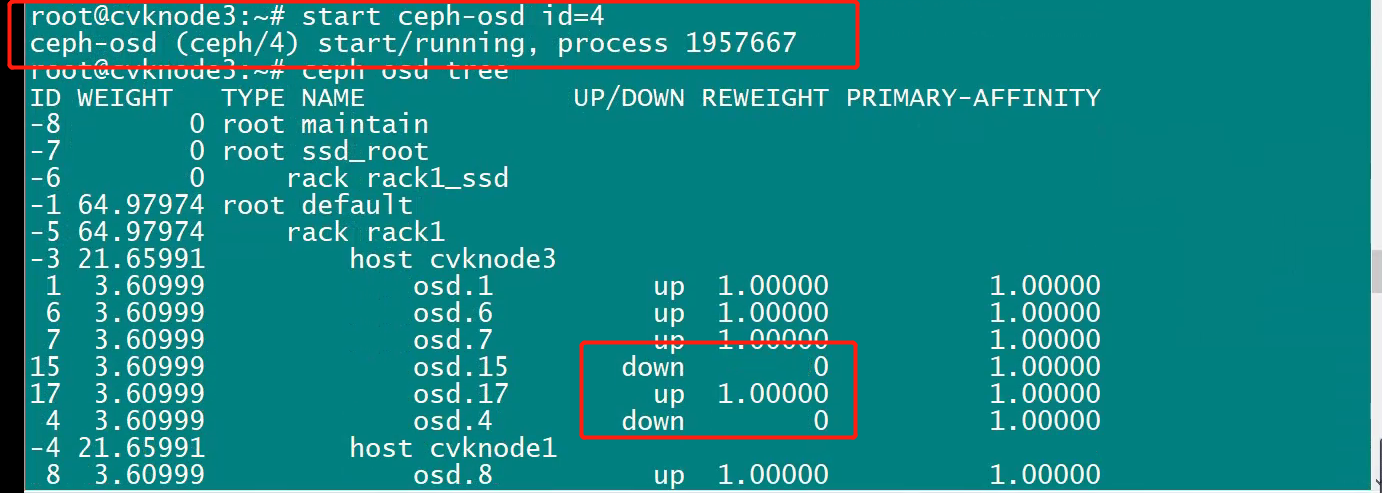 cas平台内嵌的onestor硬盘异常,HDM界面查看物理和逻辑状况健康,start ceph-osd id=x运行后仍是down状态,平台两块异常的硬盘无法勾选
