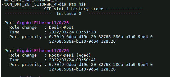 .4的g1/0/26口状态发生变化,但互联的.1口状态仍未DP,未发生变化