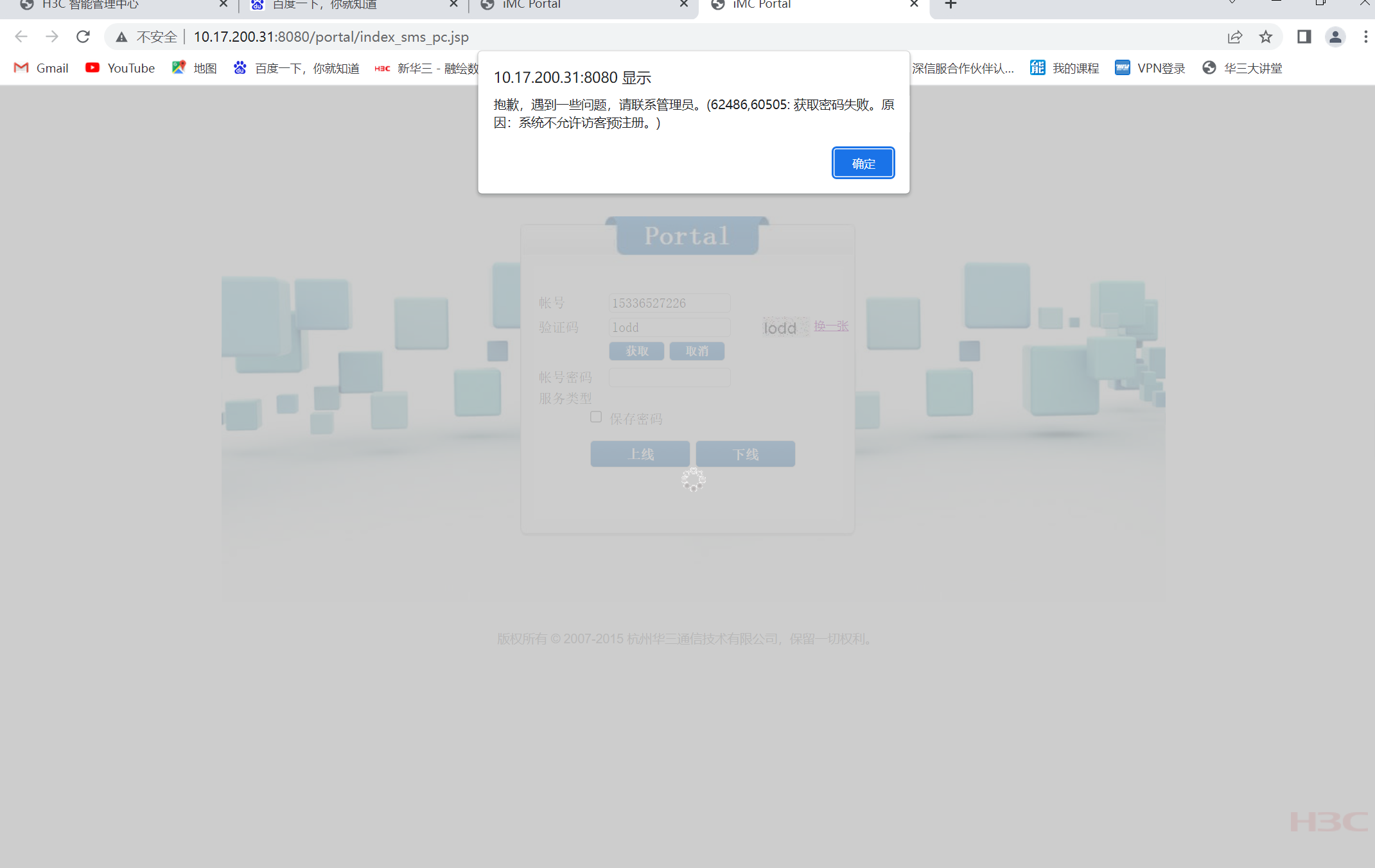 IMC短信认证失败,提升系统不允许访客预注册,这是什么没有配置对